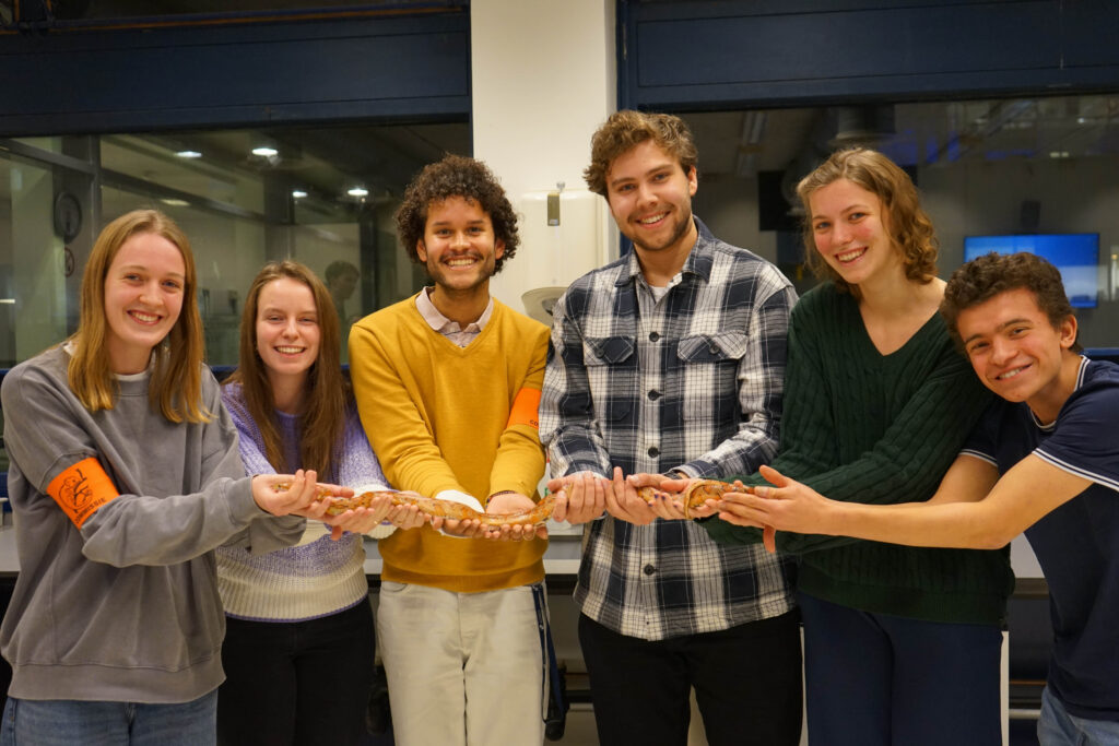 Op de foto: Introductiecommissie 2025 – Esmée, Daan, Tim, Roos, Bart en Arne
