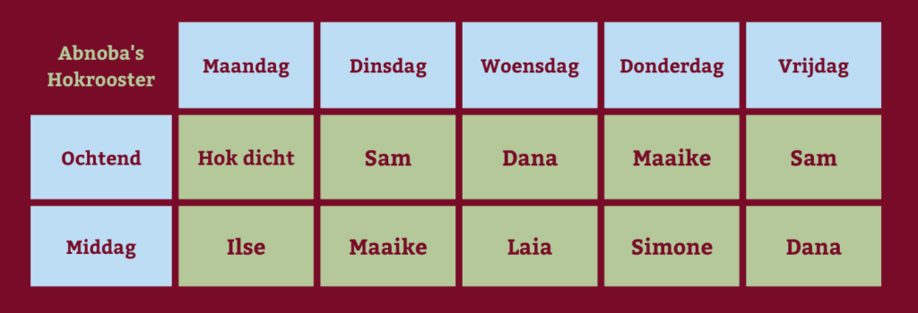 Hieronder kun je exact zien wie van ons op welke dag sowieso aanwezig is op het hok, om zijn of haar hokdienst te draaien!