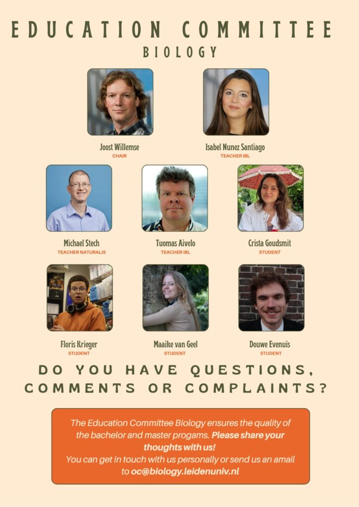 De taak van de opleidingscommissie is het waarborgen van de kwaliteit van de opleiding Biologie. Taken bestaat uit het evalueren van alle vakken van de Bachelor, minoren en Master, doormiddel van het analyseren van alle vak evaluaties die de studenten invullen na afloop van tentamens. Ook geeft de opleidingscommissie advies over vele vraagstukken van de Opleidingsdirecteur en geeft het advies over het OER (Onderwijs- en examenregeling). De commissie bestaat uit gelijke hoeveelheid docenten en studenten en vergaderen ongeveer 1 keer per maand. De commissie heeft leden uit elke instituut (IBL, Naturalis, SCS). Daarnaast heeft de Opleidingscommissie veel contact met Opleidingsdirecteurs (Dr. M. van der Zee voor de bachelor en Prof. dr. D. Claessen voor de master), om advies snel om te zetten tot acties. Studenten hebben ook de mogelijkheid om deze vakevaluaties te lezen. Je kan alle evaluaties vinden op Brightspace, onder het vak “Opleiding Biologie”. Hier vind je de cijfers en verbeterpunten van elk vak. Dit geeft je een beter inzicht tot de veranderingen voor elk vak, en geeft je de mogelijkheid om het mee te nemen als je zelf de vak evaluaties invult.